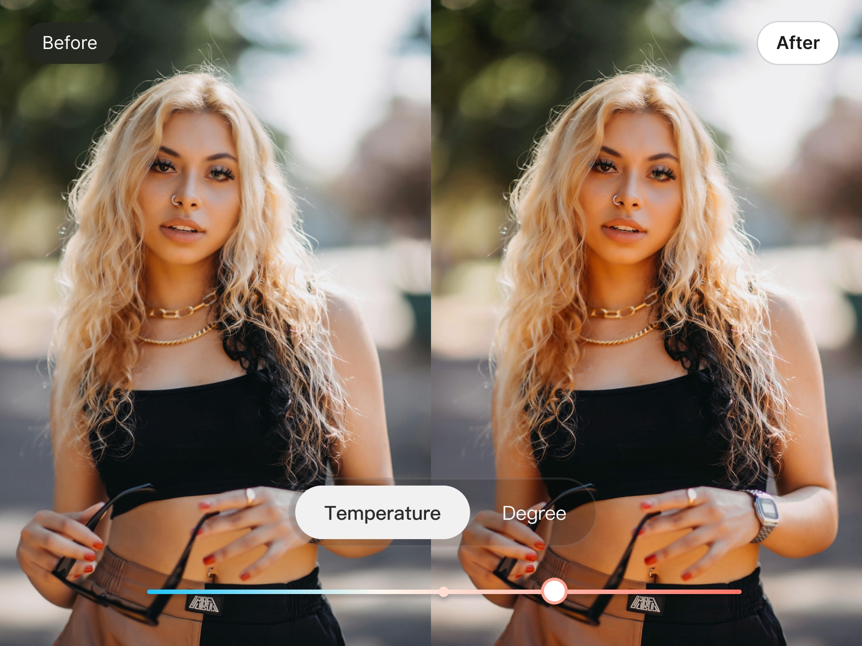 Automatically balance skin tone across the entire portrait for a clean, consistent look. Tone adjusts brightness and hue naturally, helping reduce uneven areas and subtle shadows—so your photos feel cohesive, polished, and true to life.
